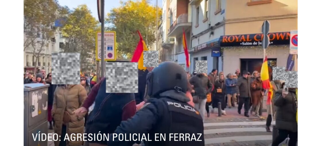 Un miembro del cuerpo de Policía propina un porrazo desproporcionado a un señor mayor que se estaba simplemente manifestando en contra Pedro Sánchez en Ferraz. PULSA AQUÍ para ver el VÍDEO En la misma imagen, de escasos segundos de duración, uno de sus compañeros arroja al suelo a un viejecito de pelo